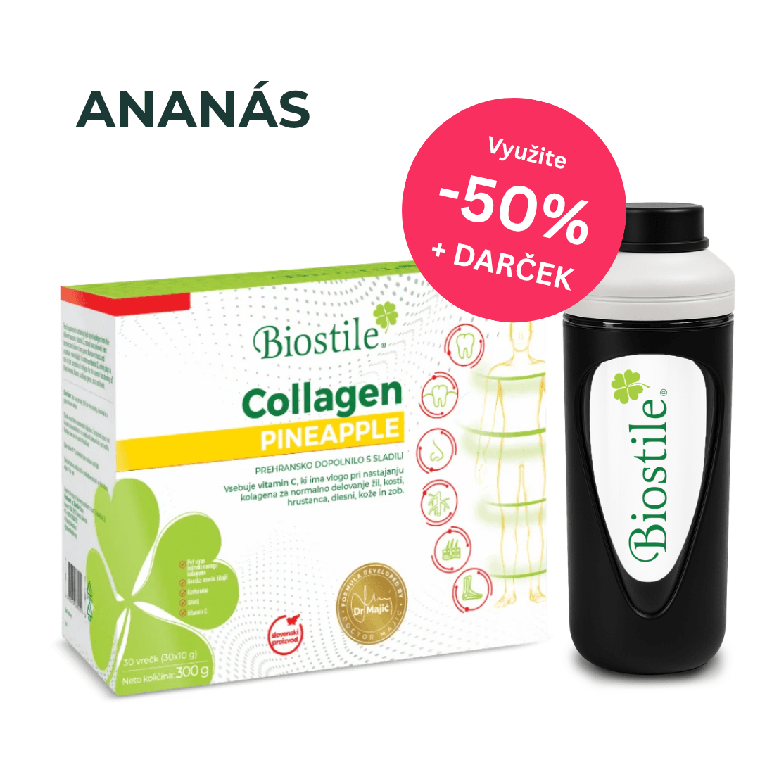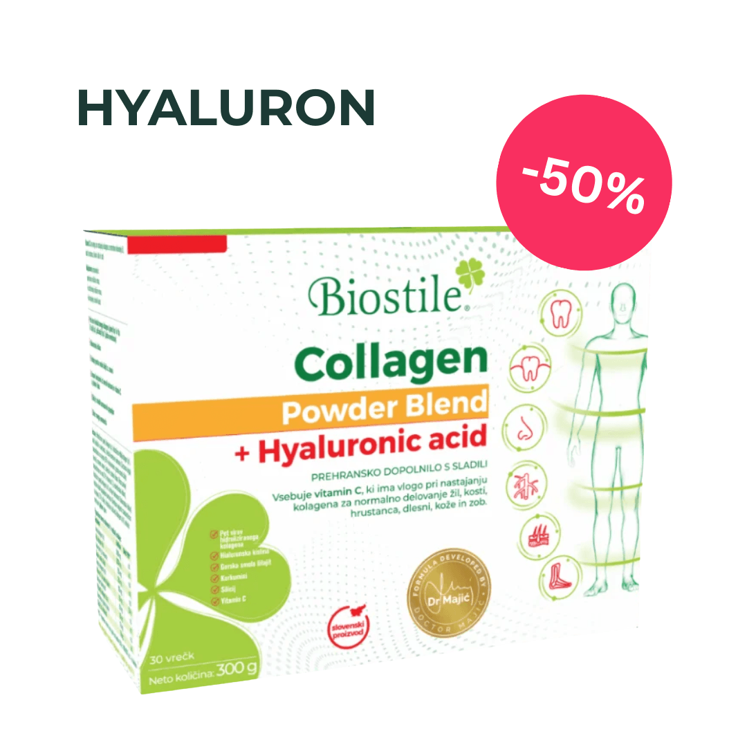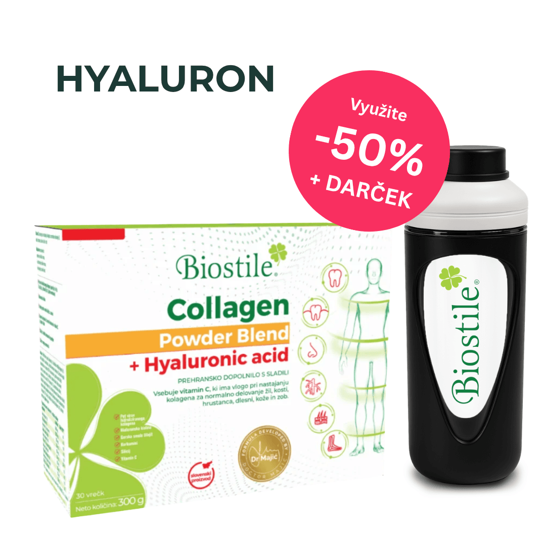 Štandardné kolagény pokrývajú len časť potrieb. Kolagén Biostile s kyselinou hyalurónovou obsahuje až 5 typov kolagénu, hyalurón pre hydratáciu a vyššiu elasticitu pokožky a silné antioxidanty s protizápalovým účinkom. To všetko v jednom vrecúšku – pre pleť, vlasy, nechty a kĺby.