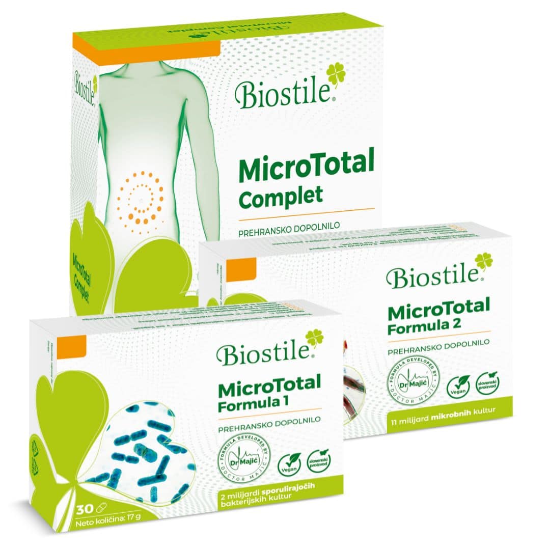 MicroTotal Complet predstavuje jedinečnú zmes bakteriálnych kultúr, ktorá poskytuje minimálne 13 miliárd kolónových jednotiek v celkovej dennej dávke. Obsahuje až 9 rôznych mikrobiálnych kmeňov, ktoré sú logicky rozdelené do dvoch formulí.