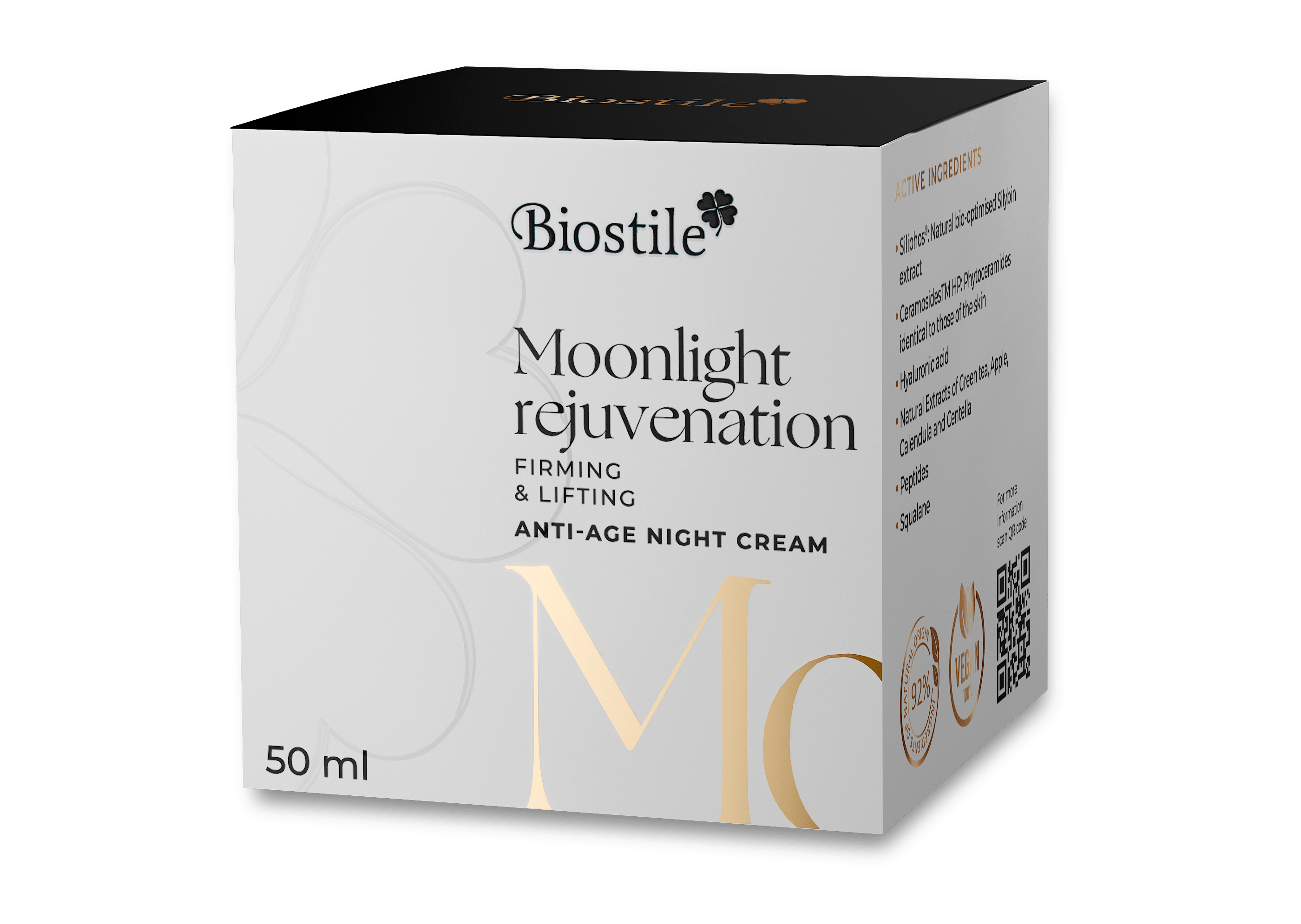 Doprajte svojej pleti omladenie a redukciu vrások počas spánku. MOONLIGHT REJUVENATION je intenzívny nočný krém proti starnutiu, ktorý obsahuje patentované zložky Siliphos® a Ceramosides™ HP, peptidy a kyselinu hyalurónovú. Je vhodný pre všetky typy pleti po dosiahnutí veku 30 rokov. Vyživuje a ošetruje pleť počas noci a obnovuje jej svieži a mladistvý lesk. Je klinicky dokázané, že zlepšuje pružnosť pleti o 74 %, zvyšuje jej žiarivosť o 70 % a zmierňuje vrásky o 24 %. Na dosiahnutie najlepšieho účinku ho používajte denne v kombinácii s naším denným krémom proti starnutiu SUNRISE REJUVENATION a naším sérom REJUVENATING ELIXIR.